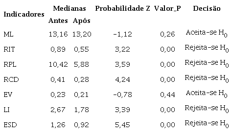 A relação significativa de indicadores de desempenho dos bancos com os indicadores de crise sanitária conduz à reflexão sobre se essas associações representam diferenças significativas de desempenho entre os períodos antes (3T2018-4T2019) e após início da pandemia (1T2020-2T2021). Nessa direção, apresentam-se, na Tabela 6, os resultados do teste estatístico que avalia se as medianas entre duas amostras emparelhadas (dependentes) são estatisticamente iguais.