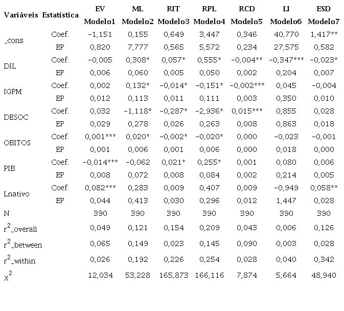 A Tabela 7 apresenta os resultados da relação entre os indicadores contábeis (variável dependente) e as variáveis socioeconômicas (explicativas), tendo sido utilizado painel com efeitos aleatórios. Todos os modelos, exceto o 7, foram ajustados pelo parâmetro p a partir de modelos de ajuste, enquanto o modelo 7 (ESD) foi aplicado com correção dos erros padrões robustos.
