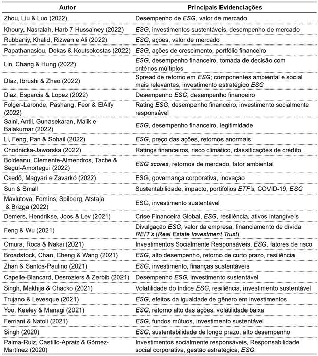 A seleção dos principais estudos que abordam os critérios ESG como um diferencial para investimentos é apresentada na Tabela 1.