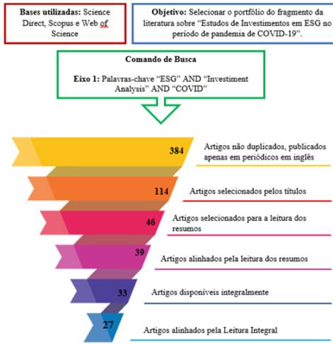 Como resultado do processo de filtragem, a pesquisa retornou inicialmente 384 publicações, considerando as três plataformas. O resultado líquido da busca é de 27 artigos diretamente relacionados com o objetivo da pesquisa; de investigar como os critérios ESG são utilizados e desenvolvidos para decisões de investimento em períodos de crises não financeiras.