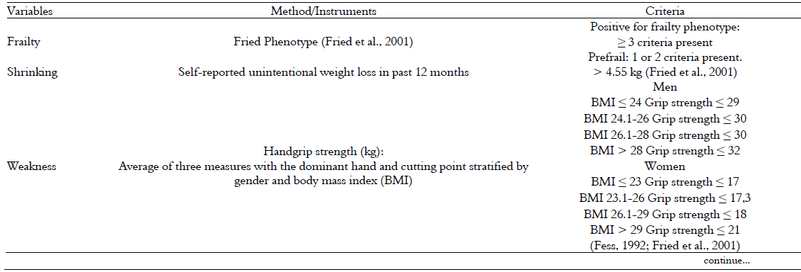 Between March 2011 and December 2012, community health workers (Agentes Comunitários de Saúde) implemented a general questionnaire in subjects’ homes to obtain sociodemographic and health data. A multidisciplinary team (geriatricians, neurologists, psychiatrists, nutritionists, occupational therapists, physiotherapists and psychologists) collected data at the outpatient unit of the Hospital São Lucas, Pontifical Catholic University of Rio Grande do Sul (PUCRS) related to the required measures for determination of the frailty phenotype, GS diagnosis and associated factors (Gomes et al., 2013). Some information was obtained from family members/caregivers or community health workers when the elderly participant was not able to answer the question (cognitive impairment).