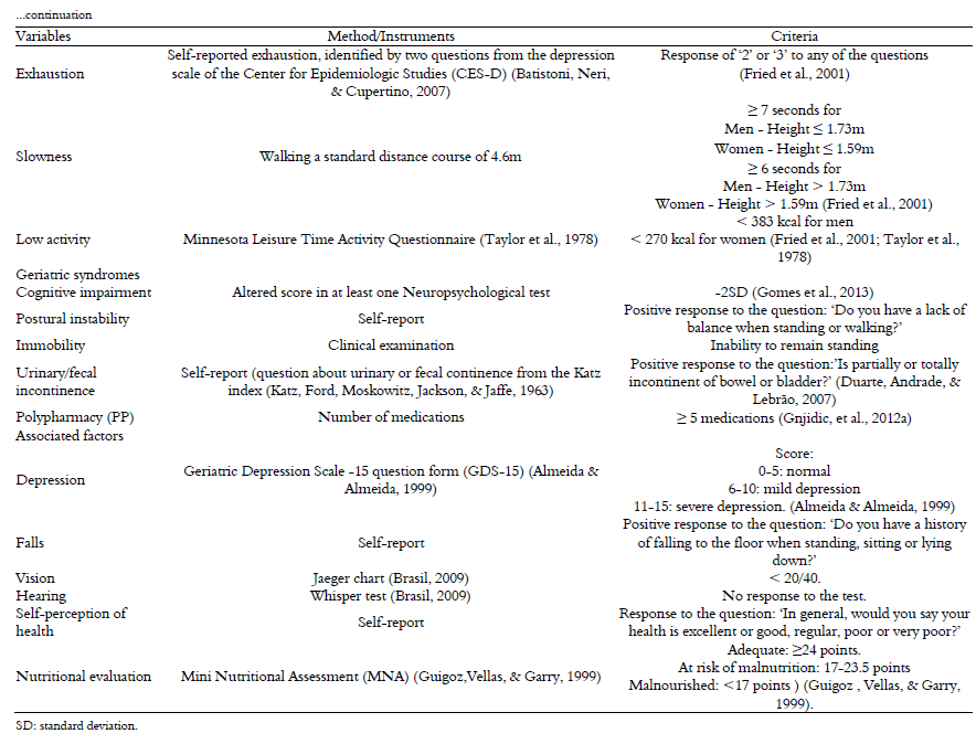This is a cross-sectional study, a part of The Multidimensional Study of the Elderly in the Family Health Strategy (EMI-SUS), whose methodology is described in Gomes et al. (2013). The sample was composed of 521 community-dwelling elderly, 60 years or more, assisted by the primary health care system, which is provided by the public health system by means of the FHS. This is the primary level of the Brazilian health system. The inclusion criteria were: individuals aged 60 years or older, registered in the FHS and from whom data had been collected for determination of the Fried Phenotype (Fried et al., 2001).