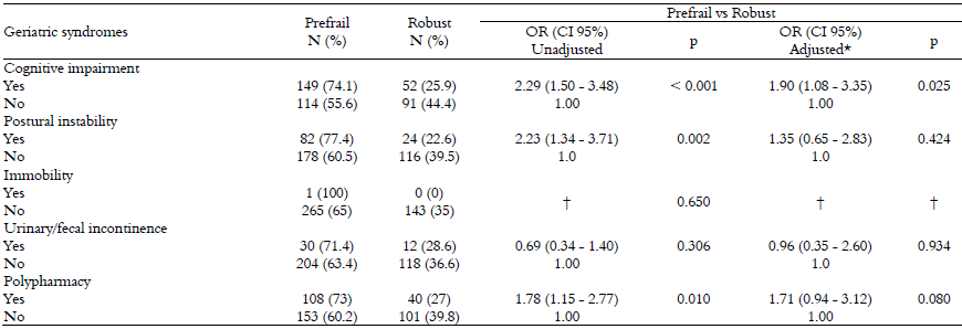 Abstract: The aim of this study was to describe the association between frailty and geriatric syndromes (GS) [cognitive impairment (CI); postural instability (PI); urinary/fecal incontinence (UFI); polypharmacy (PP); and immobility (IM)] and the frequency of these conditions in elderly people assisted in primary health care. Five hundred twenty-one elderly participants of The Multidimensional Study of the Elderly in the Family Health Strategy (EMI-SUS) were evaluated. Sociodemographic data, identification of frailty (Fried phenotype) and GS were collected. Multinomial logistic regression analysis was performed. The frequency of frailty was 21.5%, prefrailty 51.1% and robustness 27.4%. The frequency of CI was 54.7%, PP 41.2%, PI 36.5%, UFI 14% and IM 5.8%. The odds of frailty when compared to robustness and adjusted for gender, age, depression, self- perception of health, nutritional status, falls, vision and hearing, was significantly higher in elderly with CI, PI and PP. The adjusted odds of prefrail when compared to robustness was significantly higher only in elderly with CI. The most frequently presented number of GS (0-5) was two geriatric syndromes (26.87%). The frequency of frailty was high among elderly in primary health care and was associated with three of five GS (CI - PI PP).