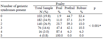 A significant association (p < 0.001) is observed between the number of syndromes and classes of frailty diagnosis (Table 5). The combination of two GS was the most frequent situation found among the 521 evaluated individuals, counting 140 (26.9%).