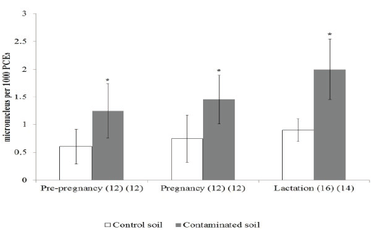 Abstract: This study aimed to measure irreversible DNA damage in the offspring of rats exposed to contaminated soil. Bone marrow cells were removed from the femurs of the offspring of rats that were exposed to contaminated soil via gavage during three different periods: 21 days prior to detection of pregnancy, during pregnancy and 21 days after birth, during the lactation period. For each group, we also had a control group under the same experimental conditions but exposed to uncontaminated soil. The results showed that pups borne of rats exposed to contaminated soil had an increase in the number of micronuclei in the different exposure groups compared with their respective control groups. This suggests a potential risk of mutagenic damage to the offspring of pregnant women who live at the sampling site.