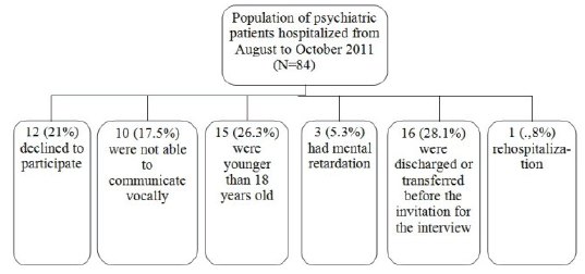 During the period of data collection 20 nursing professionals were working at the unit. All of them were invited to participate in the study. Sixteen (80%) agreed to participate (ten nursing assistants and six nurses). Among the 84 hospitalized patients, 27 (32%) integrated the sample. The reasons for the exclusion of 57 patients are shown in Figure 1: