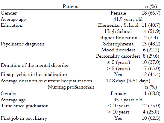 The sample was composed of the population of psychiatric patients hospitalized from August to October 2011, and nursing professionals working at said psychiatric unit.