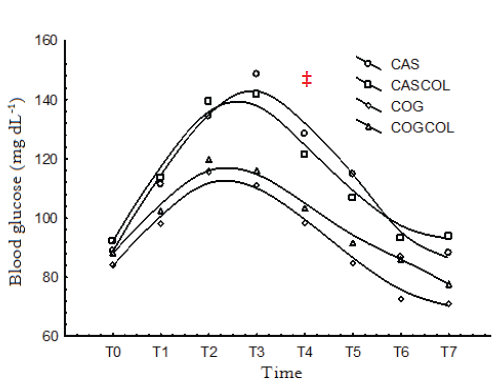 When correlation data of blood glucose and those of lipid profile are analyzed, it has been reported that animals fed on A. brasiliensis mushroom maintained high levels of correlation between these markers. Remarkably for the COG group, blood glucose and total cholesterol showed a significant positive correlation (r = 0.36; p = 0.004; n = 14), glucose and triglycerides as well (r = 0.52; p = 0.0001; n = 14), with blood glucose and HDL featuring significant negative correlation (r = - 0.70; p = 0.0001; n = 14). Lower blood glucose (or attenuation of glycemic curve), lower rates of total cholesterol and triglycerides and higher HDL cholesterol rates were registered, corroborated by Yea-Woon, Ki-Hoon, Hyun-Ju, & Dong-Seok (2005).