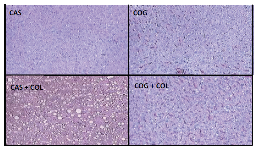Table 5 shows the histopathological analysis in rat livers fed on different diets, with or without cholesterol addition. On the other hand, Figure 2 is a photographic record of histological slides. Or rather, rat groups fed on cholesterol-enriched diets have a significant infiltration of fat in the liver and high degree of impairment of the hepatic parenchyma when compared to those of controls. Dilatation cells, displacement from core to periphery and clustering of hypertrophied hepatocytes occur.