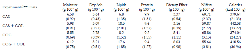 Total protein was determined in a 0.5 g sample by micro-Kjeldahl method which quantified the nitrogen content. The protein concentration was calculated by multiplying the percentage of total nitrogen by the conversion factor 6.25. Moisture was determined by an approximately 5 g sample kept in an oven at 105°C for 12 hours. Ash rate, representing the total of minerals, was determined by calcination of approximately 2 g of the sample in triplicate in a muffle furnace at 550°C for three hours. Lipids (ether extract) were determined by analyzing moisture and using ethyl ether as a solvent extractor for six hours. Ether extract obtained was placed in an oven at 70°C for one hour to remove residual solvent, cooled in a dry area and weighed. With the exception of the analysis of dietary fiber and carbohydrates, the nutritional composition was performed in triplicate, following the official method by Adolfo Lutz Institute (Zanebon & Pascuet, 2008). The insoluble and soluble fractions and total enzymatic method were done according to Prosky, Asp, Schweizer, Devries and Furda (1992) with about 1g of the sample, in quadruplicate. The method consists in hydrolyzing protein with protease, followed by hydrolysis of starch with thermal stable alpha- amylase and amyloglucosidase (glucoamylase) enzymes.