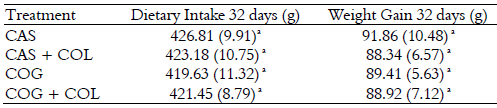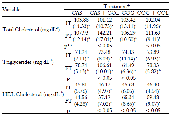 Table 4 also shows the rates of lipid concentrations in the animals´ stool. Since there is a significant difference in fecal excretion of lipids when CAS and COG groups are compared, concentration of total lipids excreted in the stool increases when the mushroom A. brasiliensis is added to the experimental diet. Similarly, comparing treatment groups and CAS + COL and COG + COL shows a significant difference and observation of virtually the same effect of increased fecal excretion of lipids.