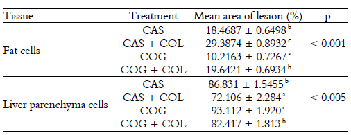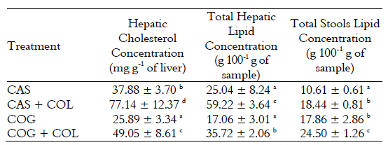 Table 4 lists concentration of cholesterol and hepatic lipids and shows that both groups of rats (COG group and COG + COL group) reduced the cholesterol deposited in the liver when compared to controls (CAS and CAS + COL). The above demonstrates that, in spite of the concentration of dietary cholesterol, there is approximately a 32% decrease in the hepatic cholesterol deposition when A. brasiliensis was added to the experimental diet.
