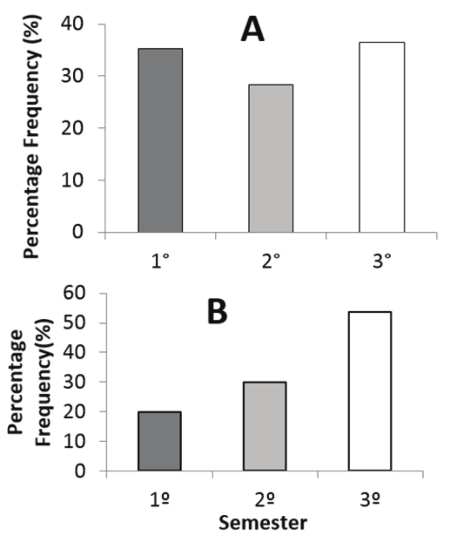 Among the students from the first to the third period, 25, 20 and 26 samples were obtained respectively (Figure 1A). From a total of 71 students, 35.2% work in hospitals, where 20, 30 and 53.8% of students are from the first, second and third period, respectively. In addition, 78.9% of students were female and 21.1% male. From the total of students, 6 were presenting flu or cold symptoms on the day of collection and 3 were taking antibiotics, thus they were not included in the study, leaving 62 students in the sample.