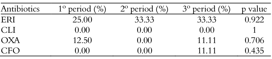 Table 1 shows that there was no significant difference (p > 0.05) between the proportions of resistant strains to antibiotics and the evaluated samples from different periods.
