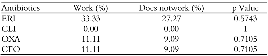 Furthermore, there was no significant difference (p > 0.05) between students working in hospitals and proportions of antibiotic resistant samples (Table 2).