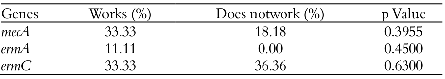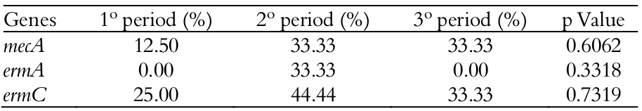 Table 3 shows there were no significant differences (p > 0.05) between the period (period) of students positive for the mecA gene, ermA, and ermC. There was also no significant difference (p > 0.05) between the positive results for the mecA gene, ermA, ermC and the fact of working in hospitals (Table 4).