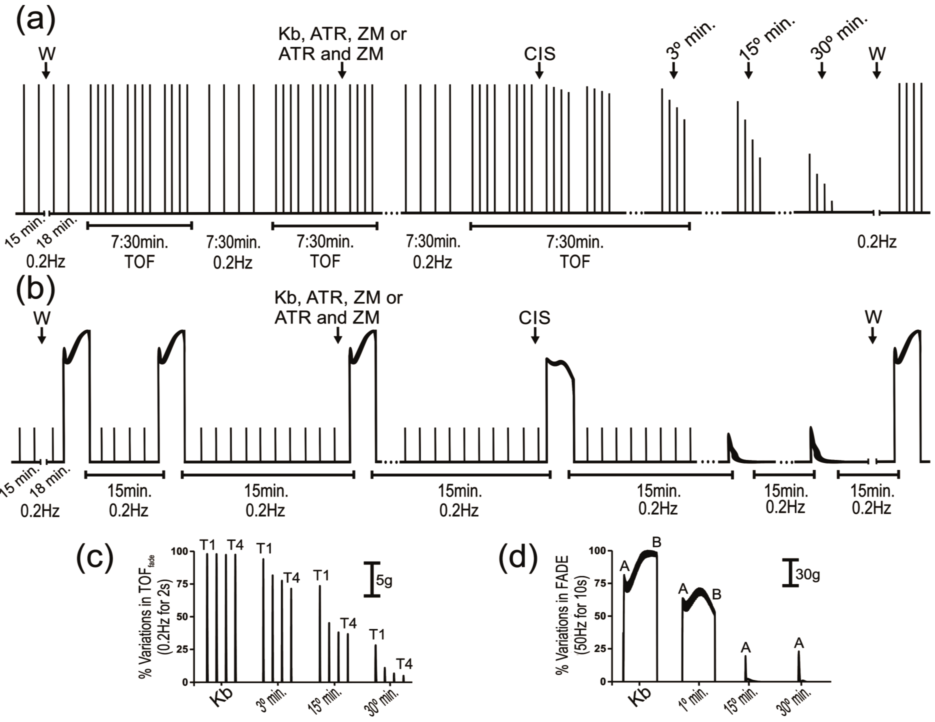 stimulus obtained at instants 15 and 30 min after the cisatracurium administration (Figure 1a) was systematically used for comparison. Preparations were stimulated indirectly with 10 s-duration high-frequency (50 Hz) tetanic trains applied at 15 min intervals so that the fading of tetanic contractions could be investigated (Figure 1c). This interval was selected to avoid the possible influence of previous tetanic stimulation on fade induced by subsequent stimuli. Initial tetanic tension at the beginning of the tetanic stimulus (A) and the tension at the end of the tetanic stimulus (B) were recorded and the B/A ratio (Faderatio) was calculated (Figure 1d). A, B and Faderatio values were obtained at the same instants used to assess the TOFfade, i.e., in the absence of drugs (control, one record of Fade), after atropine (0.2 µM) or 4-(2-[7-amino-2-(2-furyl)[1,2,4] triazol [2,3-a][1,3,5] triazin-5-ylamino] ethyl) phenol] (ZM 241385; 10 nmol L-1), separately (two records of Fade) and in combined administration of drugs (atropine or ZM 241385 followed by administration of cisatracurium). The cisatracurium concentration (2.2 µM) used was that previously tested capable of causing 25% TOFfade after 3 min from its administration in Krebs buffer (Pereira et al., 2012). Muscarinic and adenosine receptor antagonists were applied to the bath solution at a constant volume of 10 µL 1 min before the second sequence of TOF or tetanic stimulation, with the antinicotinic muscle relaxing agents, then applied 1 min before the third sequence of TOF or tetanic stimulation, respectively (Figure 1a and c).