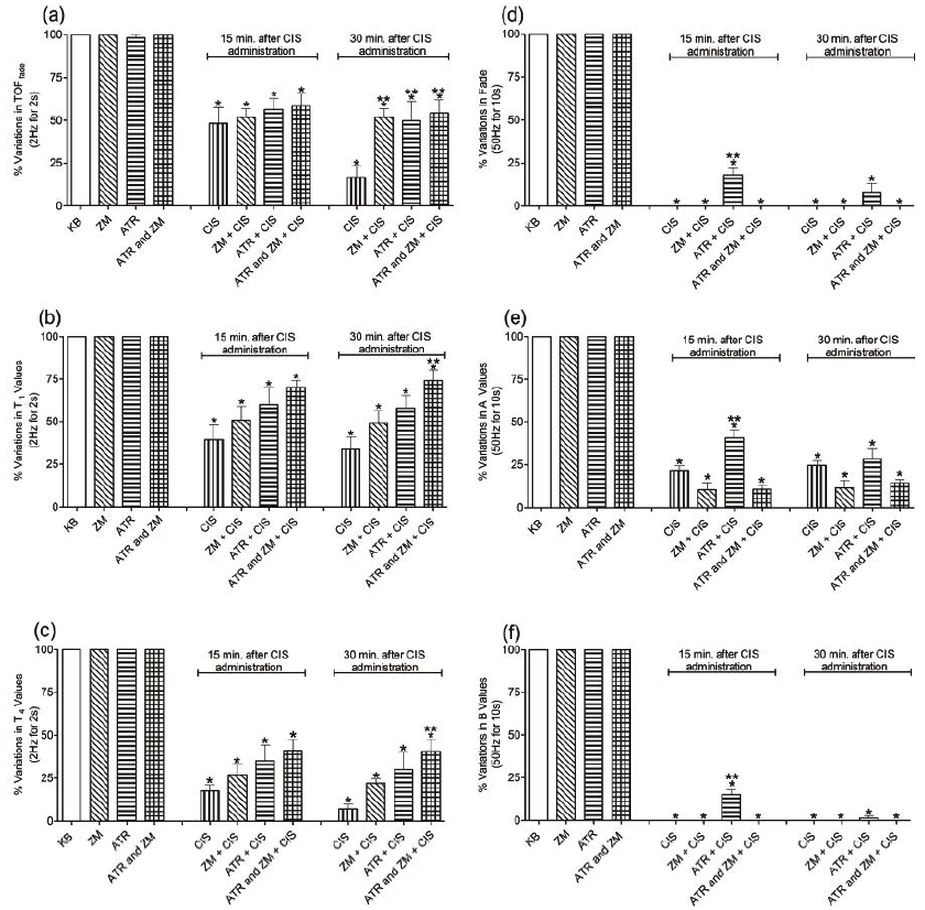 The blockage of presynaptic A2A receptors by ZM241385, or the blockages of M1 and M2 muscarinic receptors on the motor nerve by atropine, reduces (~ 48%) TOFfade caused by cisatracurium (T = 30 min). However, no significant (p > 0.05) difference has been detected between the effect caused by the blockade of presynaptic A2A and blockade of presynaptic M1 and M2 receptors by ZM241385 and atropine, respectively, in TOFfade (2 Hz) caused by