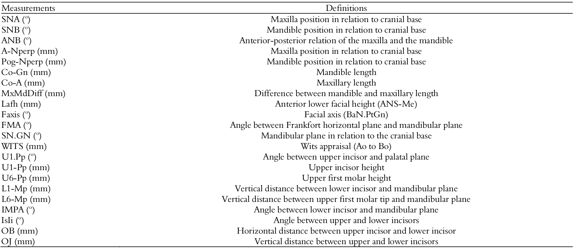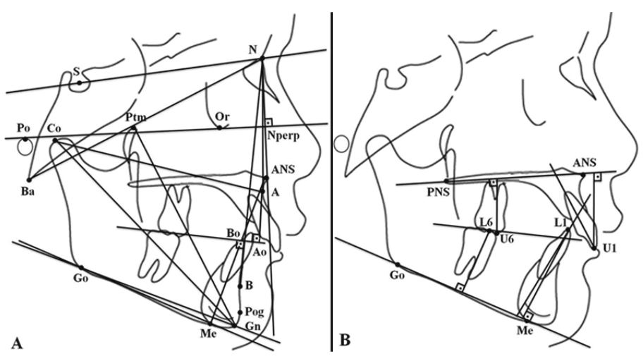 Measurements for skeletal and dental, anteroposterior and vertical relationship were obtained on all cephalograms (Figure 1). Linear and angular measurements used in study are in Table 1. Cephalometric measurements in TG were compared with those in CG. The T0 to T1 changes for all cephalometric variables in both TG and CG were annualized to adjust for different treatment periods.