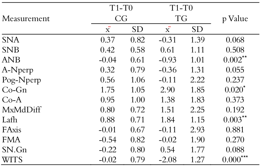 Annualized difference in skeletal cephalometric measurements ANB, WITS, Lafh and Co-Gn showed statistically significant difference. The Lafh and Co-Gn increased 0.96 and 1.15 mm in TG compared to CG, respectively. The ANB and WITS reduced 0.89o and 2.06 mm in TG in comparison to CG, respectively (Table 2).