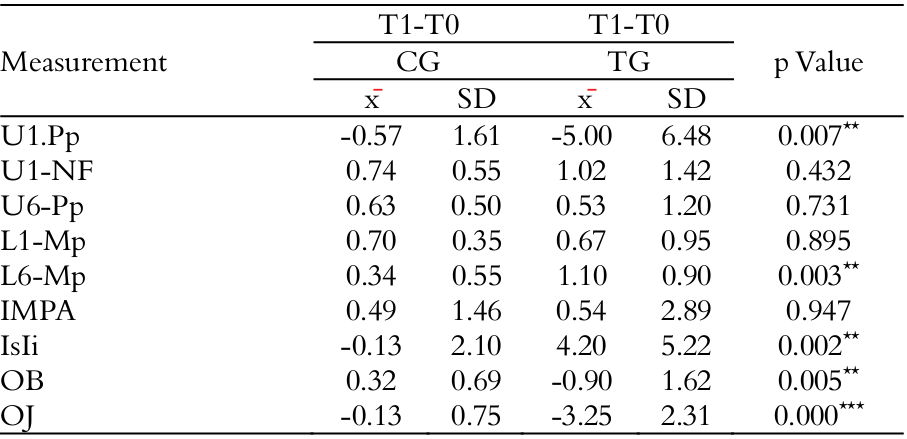 Annualized difference in dental cephalometric measurements L6-Mp, U1.Pp, IsIi, OB and OJ showed statistically significant difference. The OJ and OB decreased 3.12 and 1.22 mm in the TG in comparison to CG, respectively. The IsIi and L6-Mp increased 4.33o and 0.76 mm in TG in comparison to CG, respectively. The U1.Pp decreased 4.43º in TG in comparison to CG (Table 3).