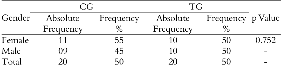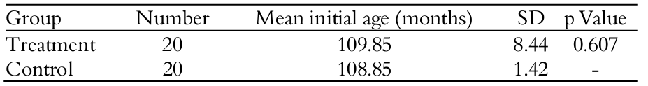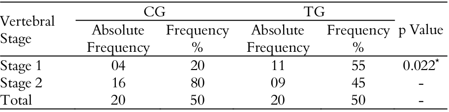 There was statistically significant difference for vertebral stage between TG and CG. Stage 1 showed 20 for CG and 55 per cent for TG and stage 2 showed 80 and 45 per cent in CG and TG, respectively (Table 4). There was no significant difference in gender distribution between TG and CG (Table 5) and no difference was found for mean age at the start of study between groups (Table 6).