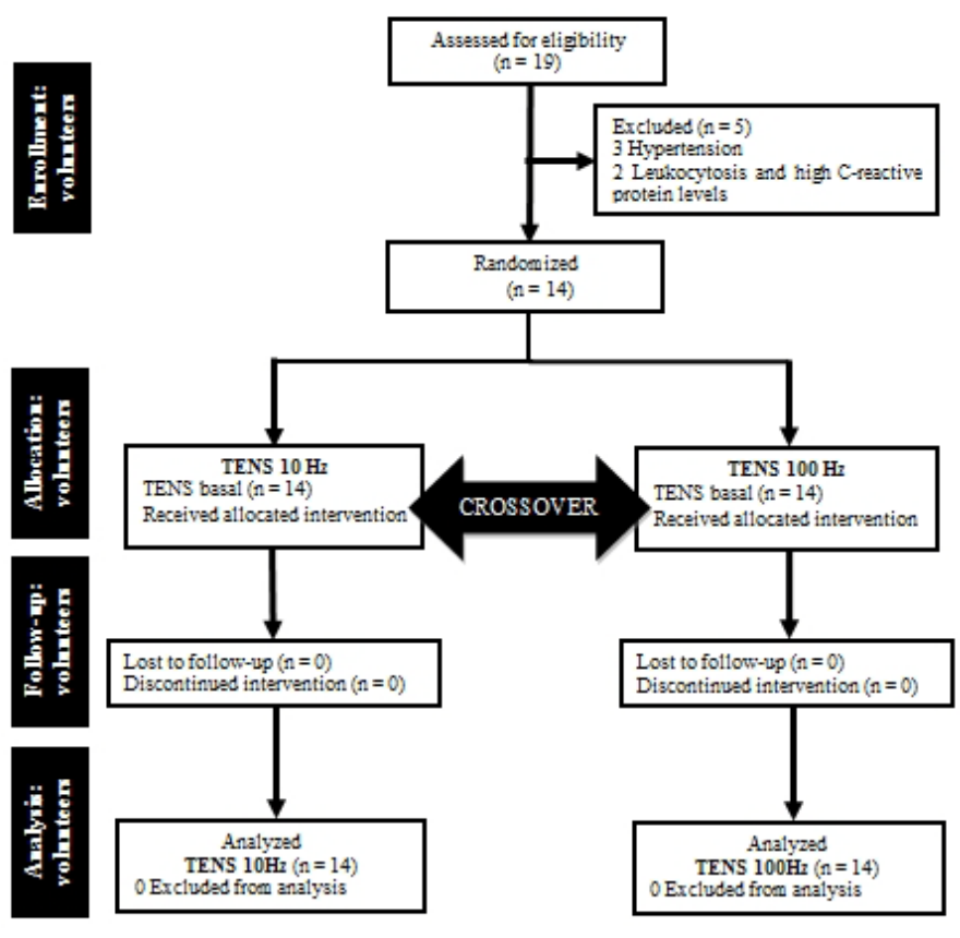 The sample was composed of fourteen volunteers (according to the sample calculation), randomized by a computer program (www.random.org). The information was sealed in a brown envelope, and the different interventions (TENS 10 Hz and TENS 100 Hz) were randomly assigned on the assessment day being the blind volunteers the interventions. Different interventions (crossover) were performed on two consecutive days. A flowchart of the volunteers is presented in Figure 1.