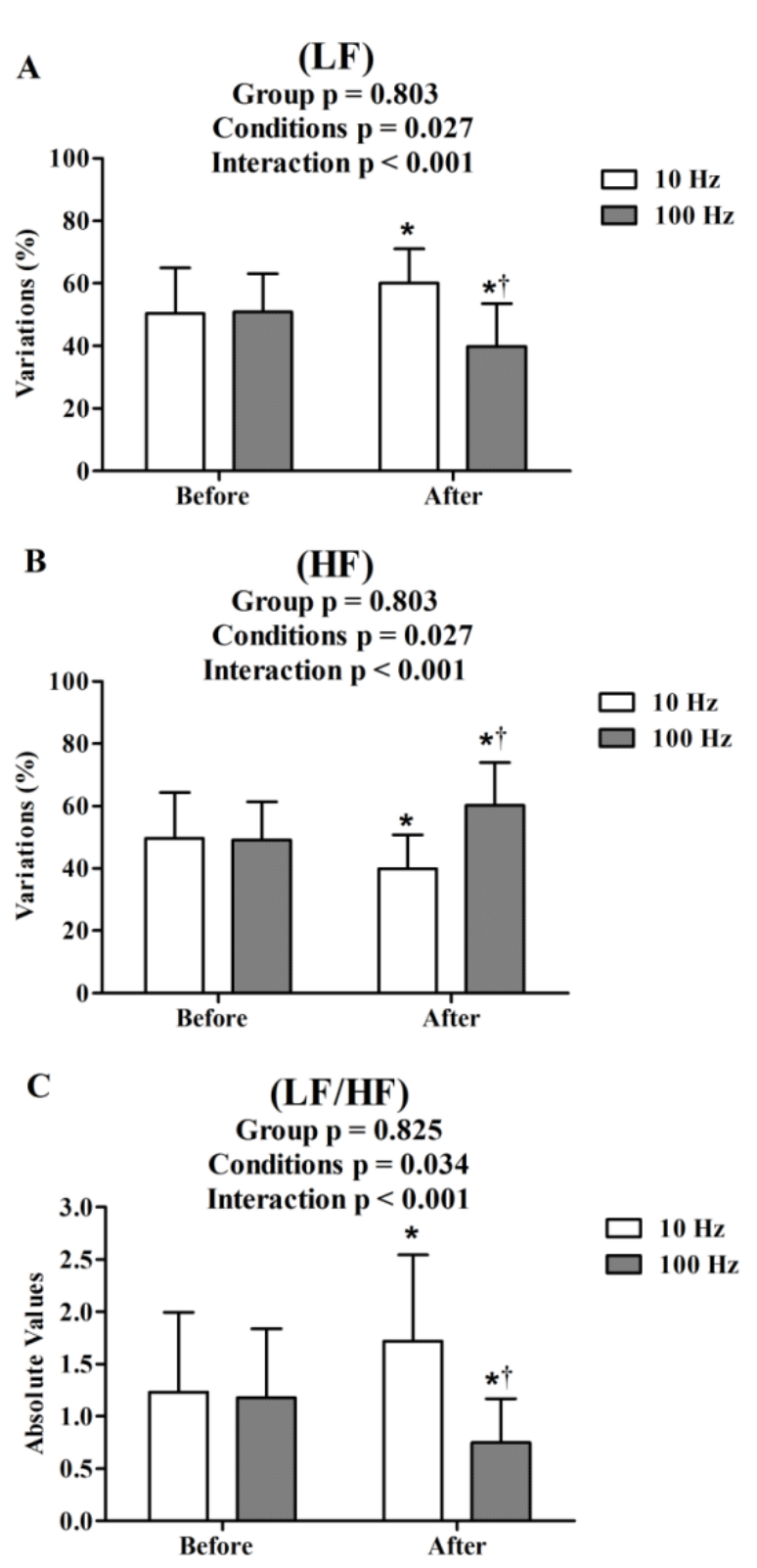 The frequency-domain analyzes demonstrated that the variance of RR intervals over the temporal segment (Total power ms2) and power in low frequency range (LF between 0.04-0.15 Hz) remained unchanged throughout the study. However, the power in high frequency range (HF, between 0.15-0.4 Hz) decreased in the low frequency and increased in the high frequency (Interaction: p < 0.001) (Table 2). After the normalization of the data, TENS 10 Hz increased 10% of sympathetic activity (LF n.u.) and decreased 10% of parasympathetic activity (HF n.u.) (Figure 3A).