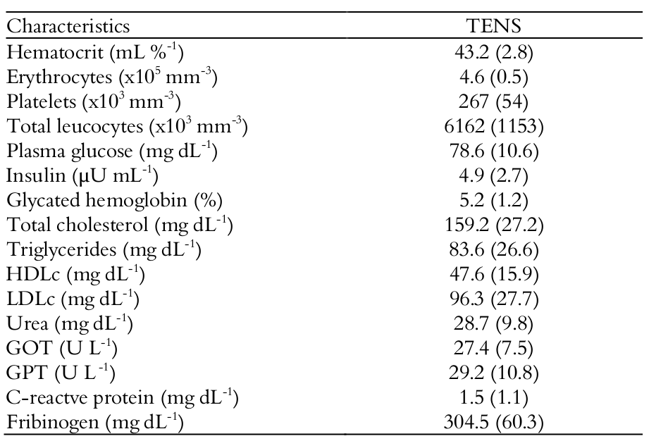 Anthropometric variables, blood samples and systemic blood pressure were collected in the fasted state of 12h in the first day of evaluations. Blood tests were automatically processed (ABX kits, Horiba Diagnóstica, Curitiba, Brazil) and analyzed by microscopy. Glucose levels were measured by Trinder assay (calorimetry) in the equipment LAB MAX 240® (Tokyo, Japan) and the glycosylated hemoglobin (HbA1c) was determined by enzymatic method using the equipment LAB MAX 240® (Tokyo, Japan). The insulin was assessed by chemiluminescence method using the equipment Immulite® DPC (Diagnostic Products Corporation – DPC, Los Angeles, CA, USA). Cholesterol, triglycerides, high-density lipoproteins (HDLc), glucose and urea were measured using commercial kits LAB TEST (Lagoa Santa, MG, Brazil) and analyzed in LAB MAX 240® (Tokyo, Japan) equipment. The low density lipoprotein (LDLc) was calculated by Friedewald formula. The serum glutamic-oxaloacetic transaminase (GOT) and glutamic-pyruvic transaminase (GPT) were measured by the IFCC method (Hitachi 917® device, Roche Diagnostics, Florida, USA). Ultra-sensitive C-reactive protein (CRP) was evaluated by nephelometry (Nephelometer Beckman Coulter, model Immage using reagents from the lab CCRP, IMMAGE, Fullerton, CA, USA). Fibrinogen was analyzed by the equipment START (Diagnóstica Stago, Asnieres, France) using commercial tests LAB TEST (Lagoa Santa, Minas Gerais State, Brazil).