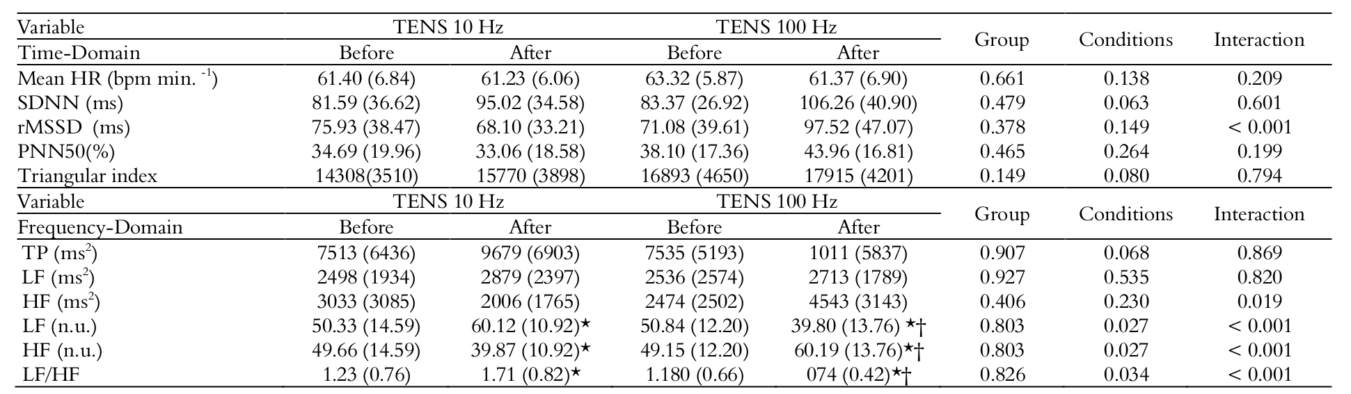 HRV data in response to different frequencies of TENS are shown in Table 2. The resting heart rate was within the normal limits and did not change across the low (10 Hz) and high (100 Hz) frequency TENS. The standard deviation of all normal to normal RR (NN) intervals (SDNN) and the percentage of intervals differing more than 50ms different from preceding interval (pNN50) did not modify in response to different interventions. The square root of the mean of the squares of successive RR interval differences (rMSSD) showed a reduction in low frequency and an increase in high frequency TENS (Interaction: p < 0.001).