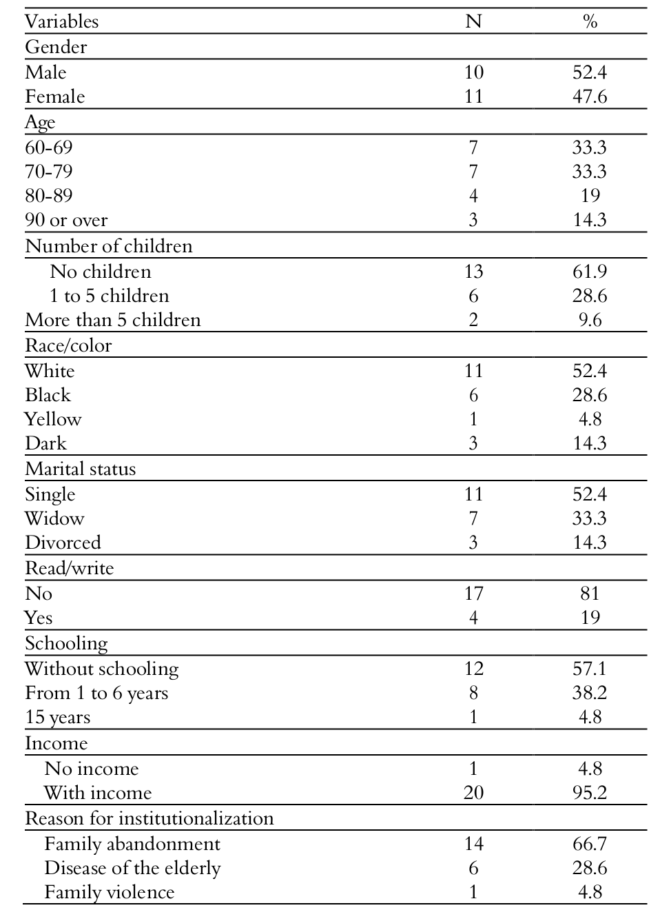 The participants were all institutionalized elderly in the period of data collection, totaling 21.