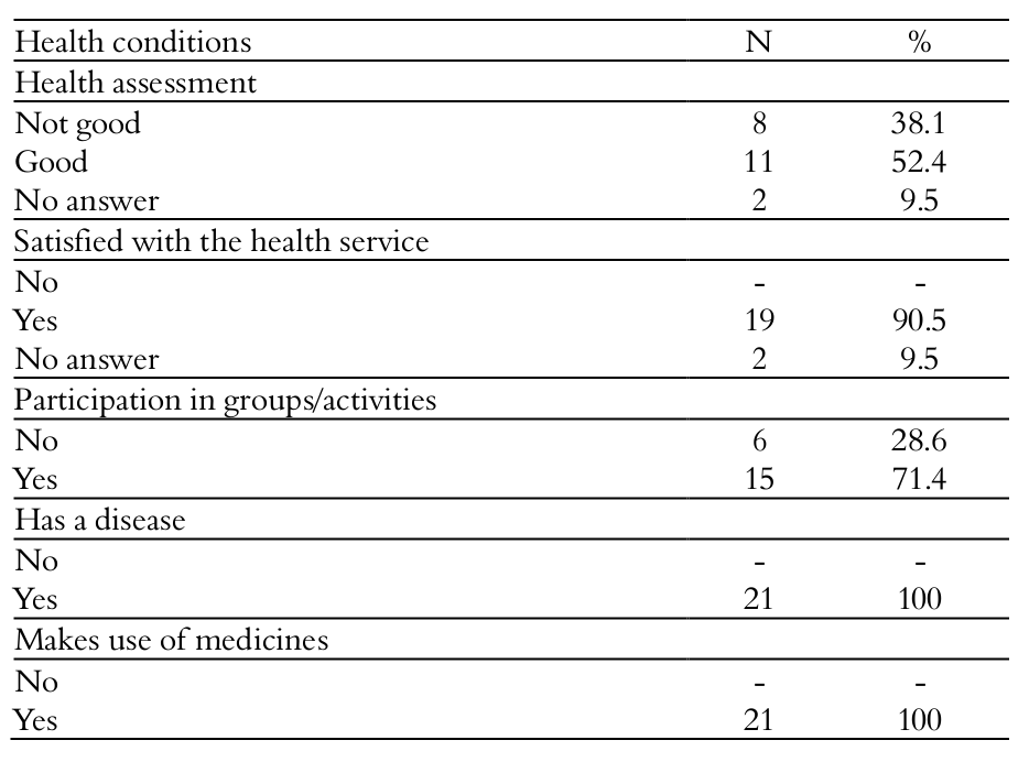 In their self-assessment of health status and care provided by the institution, most of the elderly (52.4%) rated their health condition as good, and in addition, 90.5% of them were satisfied with the service offered in LTI and participated (71.4%) of social groups or physical activities offered by the LTI, such as stretching oriented by physical therapist, or light physical activities guided by physical educator. All study participants had some kind of disease and were taking medications (Table 2).
