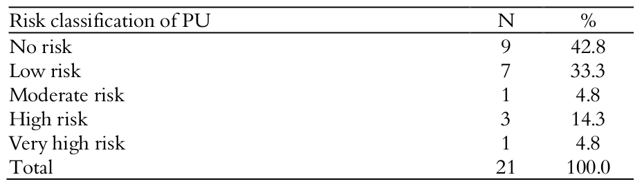 The data in Table 3 show classification of risk for PU development of institutionalized elderly. Most of the elderly were classified as without risk (42.8%) and low risk (33.3%) to PU development.