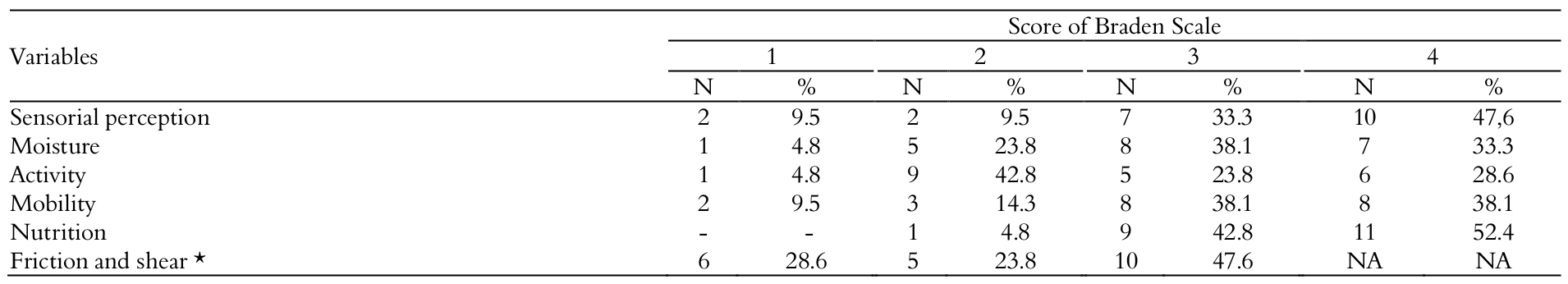 Most seniors do not have limitations in sensory perception (47.6%), mobility (38.1%), and problems of friction and shear (47.6%), with satisfactory nutritional status, since 52.38% were classified as excellent and 42.8% as adequate. However, they have the occasional damp skin (38.1%), and 42.8% are restricted to a wheelchair (Table 4).