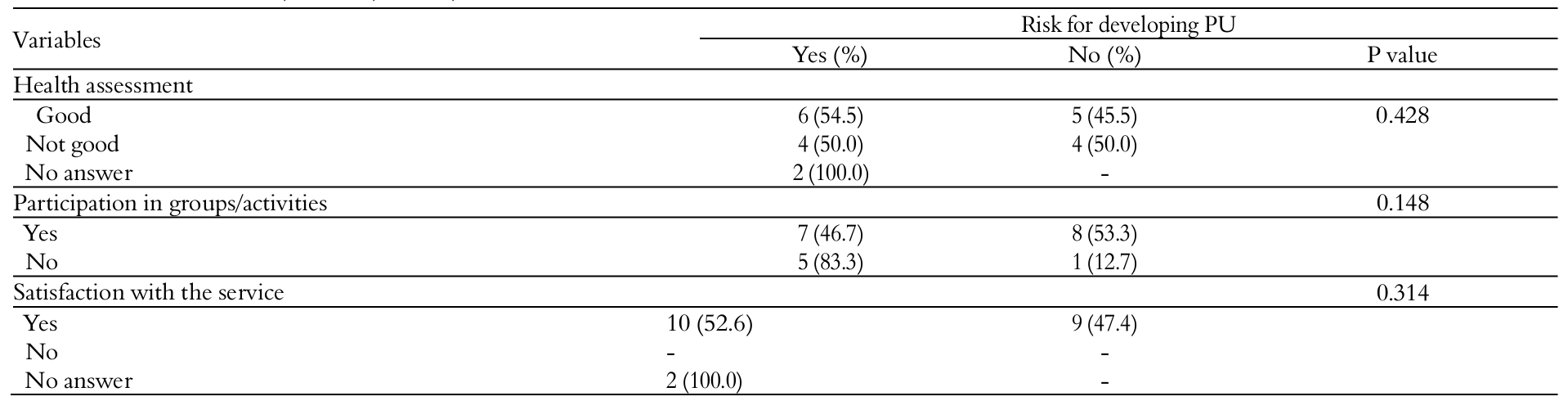 From the subjects participating in group activities it was found that 53.3% had no risk for developing PU. With regard to satisfaction with the service provided in the LTI, 52.6% of satisfied seniors presented risk of developing PU. No significant associations were found between the risks of developing PU and analyzed nominal variables (Table 5).