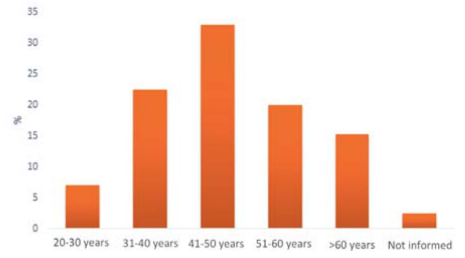 A selection of 786 clinical charts from Unicesumar and 2,702 record charts from UEM were analyzed, totaling 3,488 record charts of patients submitted to biopsy. Further, 85 (2.4%) were charts of patients who had some type of OLP. Only four patients presented skin lesions (4.7%). As regard to age, six individuals (7%) were between 20-30 years of age; 19 (22.4%) between 31-40 years; 28 (32.9%) between 41-50 years; 17 (20%) between 51-60 years; 13 (15.3%) >60 years; two patients (2.4%) failed to provide this information (Figure 1).