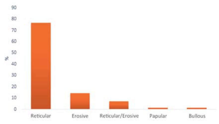 With regard to patients’ gender, 68 (80%) were females and 17 (20%) were males. Seventeen patients (20%) admitted they were smokers (20%). With reference to the types of Lichen Planus, 65 (76.5%) patients were affected by the reticular type (p < 0.001); 12 (14.1%) by the erosive type; six (7%) by the reticular/erosive type; one (1.2%) by the papular type (1.2%) and one (1.2%) by the bullous type (Figure 2). Association with Candidiasis occurred in four patients (4.7%).