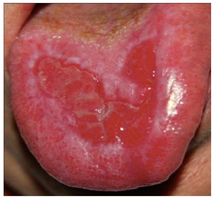 A 52-year old Caucasian female presented herself to the Department of Dentistry of UEM, complaining of a burning sensation in the mouth and sores on the tongue. When she was physically examined, several diffuse, erythematous, extremely painful ulcerations circumscribed by Wickham striae were observed. They were located on the dorsum of the tongue, retromolar region and bottom lip (Figure 3). Skin lesions, characterized by itchy papules, were observed in the flexor regions.