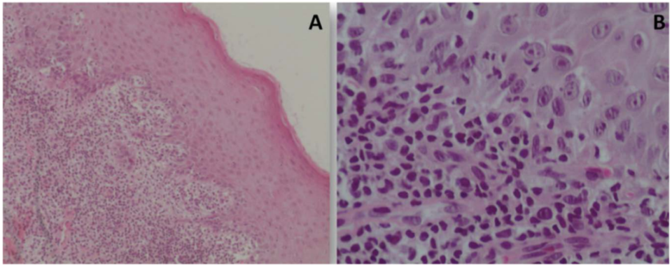 The patient reported that the oral lesions appeared nine months before and that the pain increased during meals. Systemically compromised, she was a Hepatitis C carrier; she had diabetes type 2, with gastritis and arterial hypertension. Based on the clinical aspect of the mucus-cutaneous lesions, in addition to the patient's history, the presumptive diagnosis was erosive LP. The patient was submitted to incisional biopsy on the retromolar region and on the dorsum of the tongue. Microscopic exam confirmed the diagnosis of Erosive LP (Figure 4).