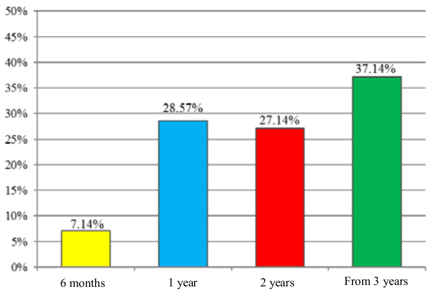 Figure 1 highlights the conduct on recommendation about the beginning of the use of fluoridated toothpastes by pediatricians. Most of them (37.14%) recommend using it only after 3 of age, whereas 28.57% recommend the use from 1 year of age, 27.14% from 2 years and only 7.14% indicate the use from 6 months of age.
