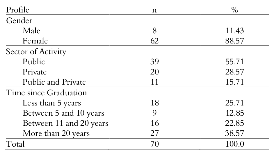The average age of the professionals interviewed was 41 years, ranging from 27 to 75 years; of the total, 88.57% were female and 11.43% male. When asked about the place of work, 55.71% worked in the public service, 28.57%, worked only in private practice and 15.71% acted both in public service and private practice. In relation to the time since graduation, 25.71% were in the profession for less than 5 years, 12.85% between 5 and 10 years, 22.85% between 11 and 20 years and 38.57% have been acting professionally for over 20 years (Table 1).