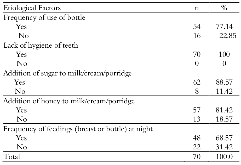Table 2 depicts the pediatricians’ knowledge regarding the etiological factors of tooth decay. It was observed that 100% of the professionals reported poor hygiene as one of the determining factors for the development of the disease, 88.57% of them reported the addition of sugar to the milk, 81.42% mentioned the addition of honey to the milk, 77.14% cited the frequency of use of the bottle and 68.57% mentioned the frequency of feedings at night.