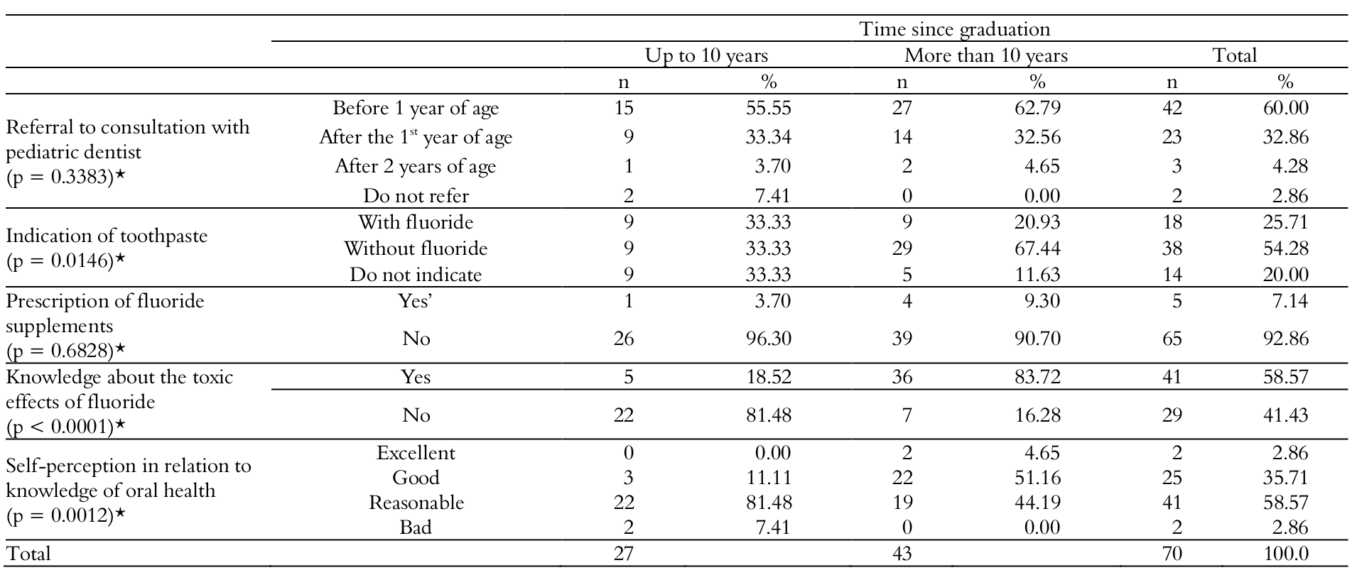 Table 3 shows that most professionals (60.0%) reported referring the child for the first appointment with the pediatric dentist before the 1st year of life. However, 2.86% of the professionals interviewed, with up to 10 years since graduation, do not do referrals to pediatric dentists. Nevertheless, these data did not show statistical significance (p = 0.3383). Regarding the indication of toothpaste, 54.28% indicate toothpaste without fluoride, and most of them feature more than 10 years since graduation. These significant results (p = 0.0146) show that the time since graduation is a factor for decision between fluoridated toothpastes or not (Table 3).