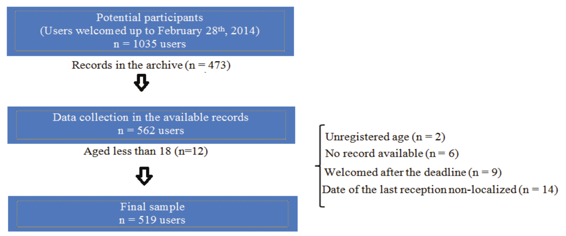 The study included the users served from February 2012 (beginning of the implementation of the reception file at the service) to February 2014, who had reception files, records and PTS.Users whose files were inactive for not attending the CAPS for more than one year, those who had no records of age or date of birth nor date of the last service were excluded.