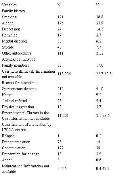 Data were collected through a documentary analysis of the reception records from July 1st to August 8th, 2014. Data was recorded in a form previously prepared and discussed with experts (experts of the area) and included socio-demographic characteristics (sex, age, schooling, occupation, monthly family income); health history (family history, previous treatments, unit search); history of drug use and motivational status. It was recorded the motivational status identified in the files, which is filled up by the service, according to the URICA classification (Brazilian adaptation) scale (Del Rio & Oliveira, 2008).