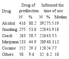 The difficulties presented by nurses for the management of drug use and abuse are aggravated by observing the results of this study, in which the drug of predilection is alcohol or tobacco with an average of 18 to 19 years of use. Data that confirm the CEBRID study (Carlini et al., 2010), in which the highest dependence is still on alcohol, although crack is a drug of great social and political repercussion.