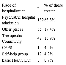 The data indicate that the majority of users have already been admitted to a psychiatric hospital, followed by the therapeutic communities. It draws attention to the specificity of a drug user who experienced 47 hospitalizations. This context shows the need for reassessment of drug treatment modalities and an in-depth discussion on the practice of psychosocial care. The model of biopsychosocial care is able to lead the professional to improve the quality of the care in the follow-ups and attendance to the demands based on the singularity of the person (Kessler et al., 2010).