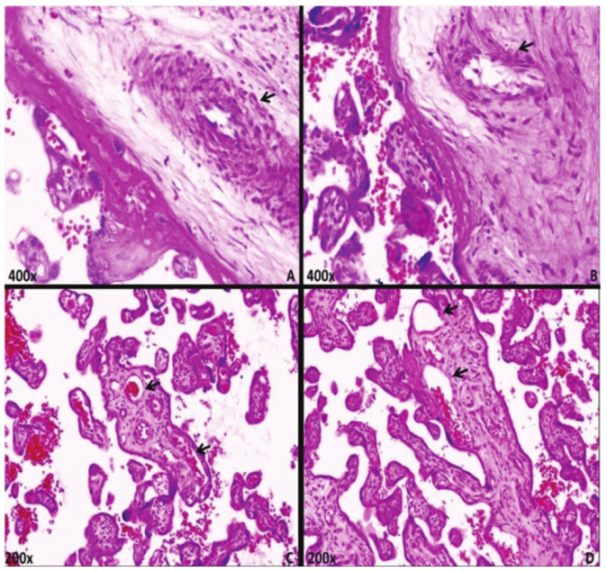 Through the histological analysis of placental tissues, we were able to evaluate the differences between healthy placentas and those ones from women with pre-eclampsia, and obatined an overview of their morphology. These differences, also described in previous studies, refer mainly to the increase in the diameter of blood vessels in healthy placentas and the poor replacing of the endothelial layer in the maternal spiral arteries by extravillous cytotrophoblasts of fetal origin, as can be seen in Figure 1.