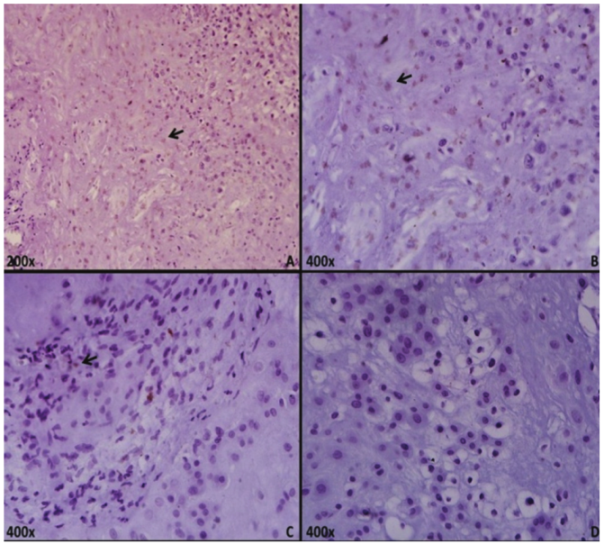The criteria for reading the slides, stained by IHC, was the BK marking in the deciduous region of the placenta, identified by the brown staining. The observation of the microscope slides was performed at 10, 40 and 100x magnifications.
