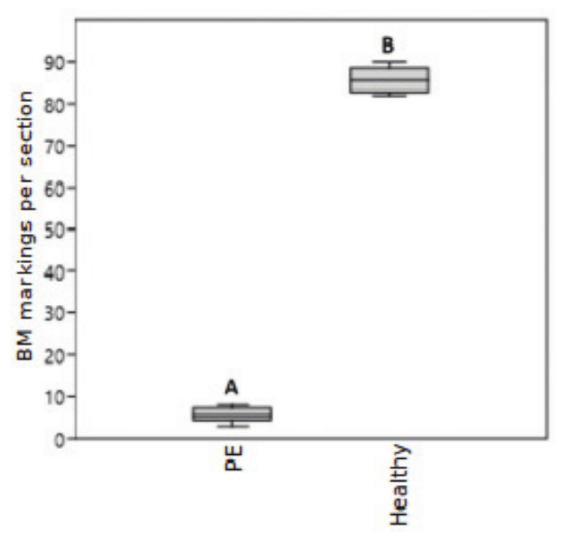 We entered the data gathered in this experiment in the programs ‘Paleontological Statistics software package for education and data analysis’ 3:06 (Past) and R (Ihaka & Gentleman, 1996; Hammer, Harper, & Ryan, 2001), in which the statistical evaluations were performed after the calculations for mean values and standard deviation. The Shapiro-Wilk test was used to verify the normality of the data and the parametric Student’s t-test was applied to compare the means of BK markings per section between the group of healthy placentas and the preeclamptic placentas group. The graph was plotted in boxplot. We adopted the significance level of 5%.